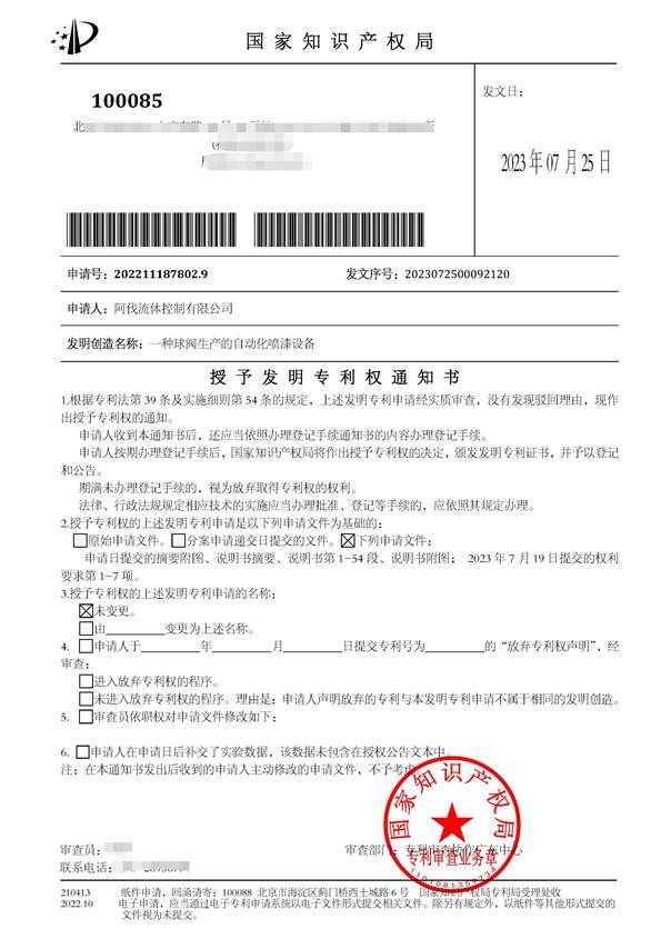 2023725日,阿伐流体控制有限公司(以下简称“AFA公司)再获两项国家发明专利授权,这是继今年6月份《一种耐磨C型球阀》获得国家发明专利后的又一重大突破。这两项发明专利分别名为《一种球阀生产自动化喷漆设备》和《一种具有调节功能的C型球阀》。至此,AFA公司获得国家发明专利授权数已达到4项。